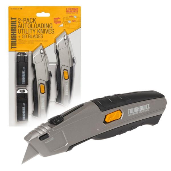 Pack 2 cutters TOUGHBUILT TB-H4S52-20-BEA avec mécanisme autochargeur, boîtier en zinc durable, poignées ergonomiques antidérapantes et 50 lames de rechange incluses.