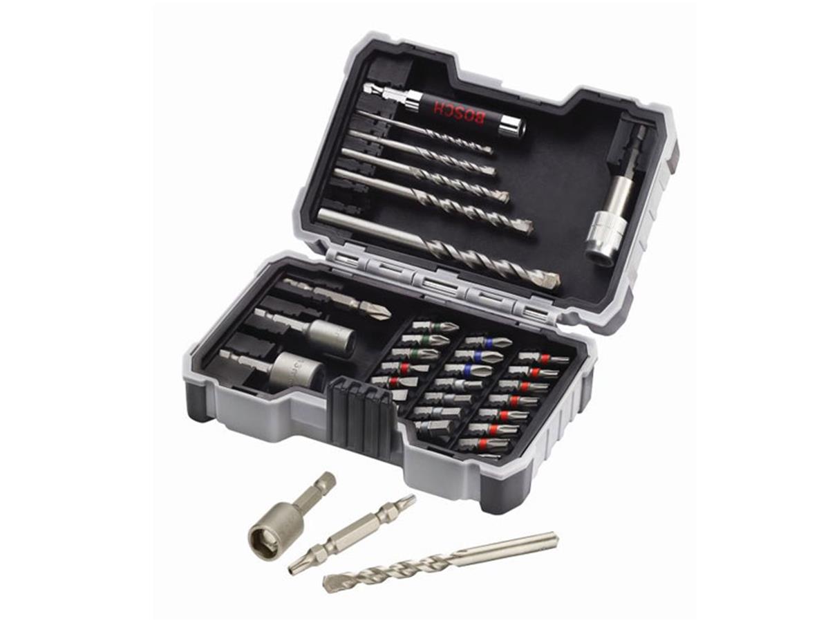 Jeu de 35 forets et embouts de vissage avec porte-embout universel à changement rapide et porte-embout universel magnétique.