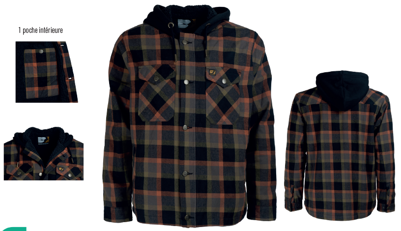 • Poches : 2 poches basses en biais, 2 poches poitrine à rabat, 1 poche intérieure à pression