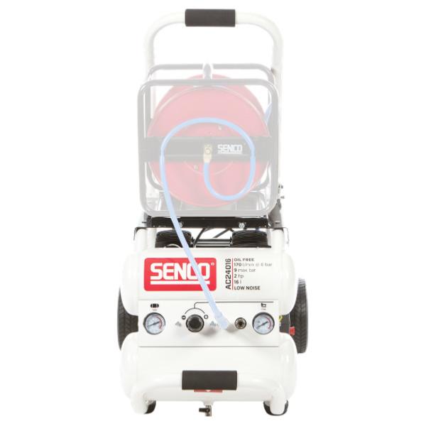 Grâce à son faible niveau de vibration et de bruit (70 dB), ce compresseur peut être placé directement sur le poste de travail de l'opérateur. Possibilité de monter votre enrouleur de tuyau SENCO sur votre compresseur pour faciliter le transport !