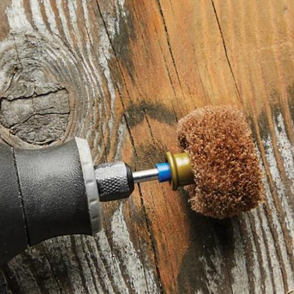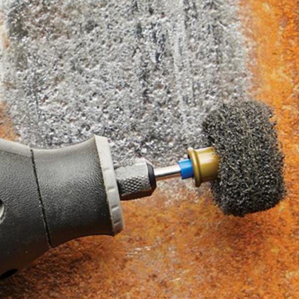 Après avoir mis en marche l’outil, appliquez LÉGÈREMENT le polissoir contre le matériau et parcourez la surface à plusieurs reprises jusqu’à ce que le matériau soit propre. Avec cet accessoire, le meilleur résultat est obtenu en ne touchant que légèrement la surface. Lorsqu’une pression est exercée, le polissoir risque d’être endommagé et de s’user plus rapidement que la normale. Pour prolonger la durée de vie de l’accessoire, utilisez-le avec une vitesse ne dépassant pas 15.000 tr/min. Compatible avec le mandrin breveté SC402 EZ SpeedClic Dremel et le mandrin standard 402.