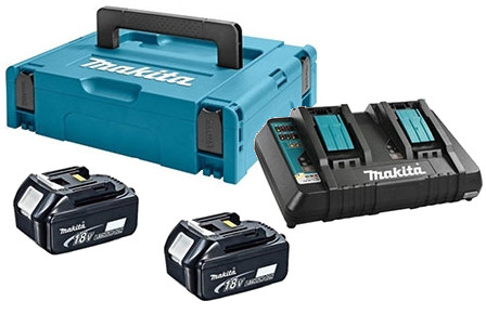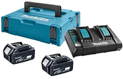 Pack énergie composé de 2 batteries 18 V Li-Ion avec témoin de charge intègré et d'un chargeur double DC18RD livrés dans un coffret MAK-PAC 3 ( 821551-8) et un moulage (839205-3). Temps de charge des 2 batteries BL1840B : 36 minutes.