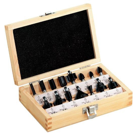 Contenu : 4 x fraise à rainurer : 6 mm; 10 mm; 12 mm; 16 mm; 3 x fraise à gorge : 12,7 mm, R 6,3mm; 9,5 mm; R 4,8 mm; 21,8 mm; R 6,3 mm; 1 x chanfrein/fraise à affleurement : 31,5 mm; 45°; 1 x fraise à rainurer en V 12,7 mm; 90°; 2 x fraise à arrondir : 28,1 mm; R 9,5 mm; 21,8 mm; R 6,3 mm; 1 x fraise à affleurement : 12,7 mm; 1 x fraise queue d'aronde : 12,7 mm; 14°; 1 x fraise à profiler : 25 mm; R 4,5 mm; 1 x fraise à feuillurer : 22,2 mm