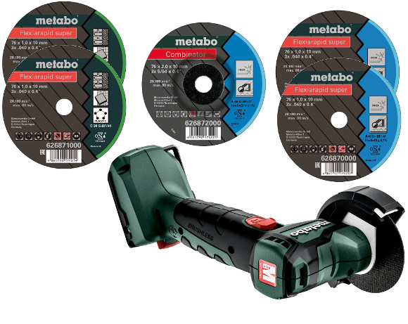 INCLUS : 2 meules de tronçonnage « Flexiarapid Super » Inox + 2 meules de tronçonnage « Flexiarapid Super » Universal + 1 meule de tronçonnage et d'ébarbage « Combinator » Inox + coffret MetaLoc