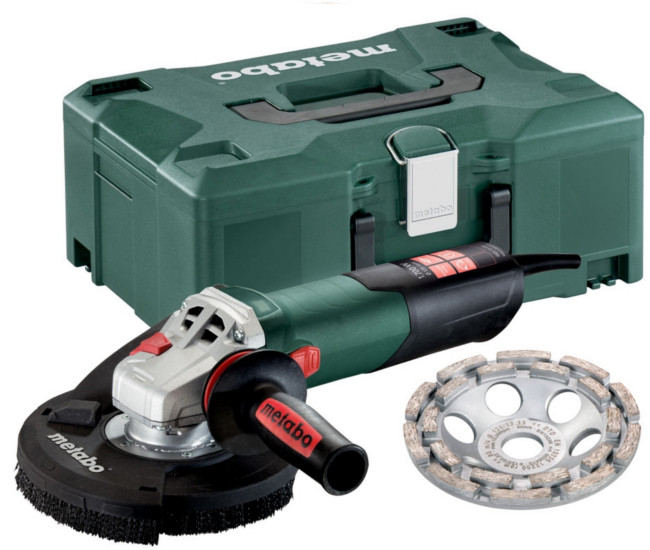 INCLUS : Poignée supplémentaire Metabo VibraTech (MVT) + Capot de protection + Capot d'aspiration GED 125 + Flasque d'appui + Écrou à deux trous frontaux + Meule-boisseau diamantée Béton « classic » + Clé à ergots + Coffret MetaLoc