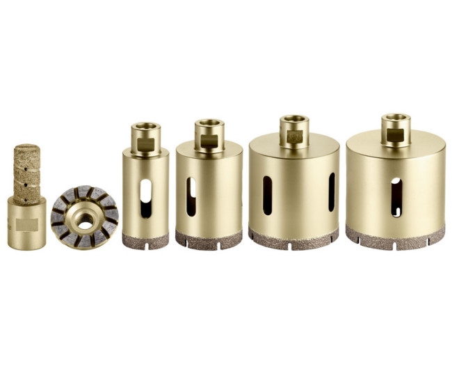 Set composé de : 1 x Ø 35 mm, 40 mm, 50 mm, 68 mm + fraise diamantée 20 mm + meule-boisseau diamantée 50 mm