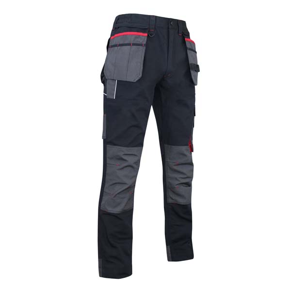 Ceinture élastiquée côtés • braguette zip spirale • anneau «D» • 2 grandes poches main + 2 poches outils amovibles et rétractables • cuisse gauche : 1 grande poche zippée à soufflet + 1 grande poche à rabat + 1 poche téléphone • poches genouillères double position • dos : 2 grandes poches à soufflet avec rabat auto-agrippant • 1 poche mètre • 1 porte marteau • ceinture rehaussée dans le dos • renfort fond • empiècements et éléments renforcés en oxford 600D membrané résistant et imperméable • doubles et triples piqûres • points d'arrêts et empiècements contrastants • passepoils rétro réfléchissants