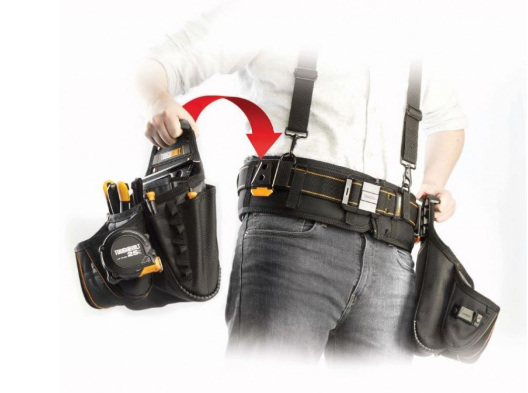 Set 11 pièces TOUGHBUILT TB-CT-153-11 comprenant 3 sacs à outils, 1 ceinture rembourrée, 1 rail mural 60 cm et 6 ClipTech™ Hubs. Rangement optimisé pour ceinture, mur ou véhicule. Idéal pro chantier.