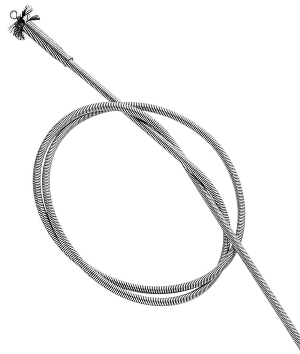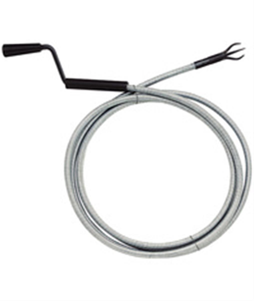 Furet n° 4 : Cable en fil d'acier galvanisé à chaud, enroulé à spires jointives : très grande flexibilité permettant d'épouser les courbes à rayon court (inférieur à trois fois le diamètre de l'outil). Manche pour faciliter la rotation.
